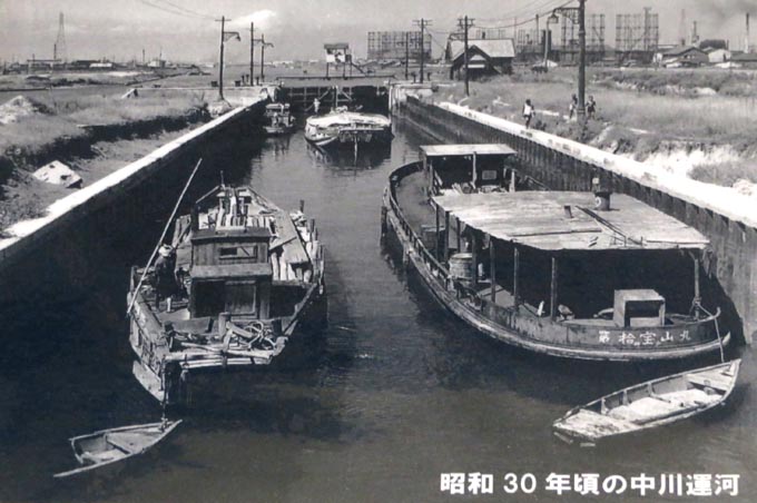 画像は昭和30年頃の、名古屋港に通じる中川運河の寸景写真である。はしけが閘室内で水位調節のために待機しているところである。