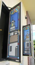 3. 灯台の資料展示室では、超ミニの「灯台博物館」であっても、その窓ガラスには灯台をモチーフにした美しい絵が