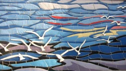 見上げるのに疲れてふと下に目を落とす。腰掛用の石が台座がいくつか置かれている。側面にはいろいろな海の生き物、