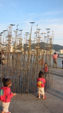 プラサ中央辺りをアートが飾る。魚市場らしく、また漁業の町らしく魚をモチーフにしたアートである。