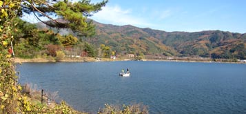 晩秋の山梨県・河口湖。太公望が二人して湖上で糸を垂れる。狙いはブラックバスか。湖を取り囲む山々の紅葉が晩秋にして