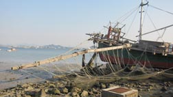 1-2. 引き潮時。両舷から張り出したブームにトロール網(引き網)が施されている様子がよく分かる。[拡大画像: x24417.jpg][拡大画像: x24418.jpg]