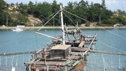 出した長いブーム・桁に施された網の中へ、流れとともに自然と入り込んで来るエビを気長に待つのである。昨今高騰する燃油も必要なく、