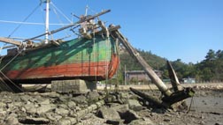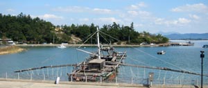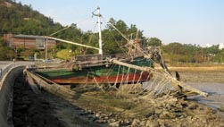1-2. 引き潮時、両舷から張り出したブームにトロール網(引き網)が施された様子がよく分かる。 [拡大画像: x24419.jpg]