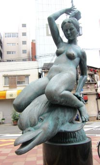 意訳的には「イルカ(海豚)にまたがり戯れる乙女」とした。「Yuki Shintani」作とされるが、作品を紹介する銘板がなく詳細は不明である。