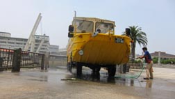 陸上要員のおじさんが、ホースで船体というか車体というか、ボディのうち海中に没していた下方部の塩っ気を真水で入念に