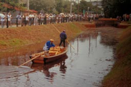 舟の向かう先に木製の関(=堰・閘門)がある。