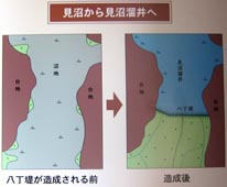 8. 左図は、「八丁堤が造成される前」にあっては、見沼は沼地であったことを示す。東西には台地 (茶色部分) が広がっている。