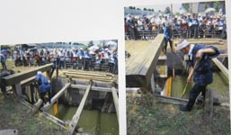 2. 見沼通船堀の通船実演 (以下5.まで)。閘門(関)で、「角落」 (かくおとし) と呼ばれる板 (長さ約3m、幅約20㎝) 8枚が木枠に