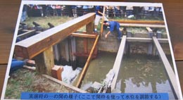 4. 長さ3m、幅18-20㎝の角落板8-10枚を鳥居柱に沿って木枠にはめ込んだり、引き抜きいたりして水位調節を行う。