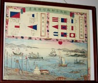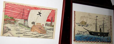 資料館に展示される和船、洋帆船、汽帆船 (蒸気機関・帆装折衷船) などを描く絵図のいろいろ。