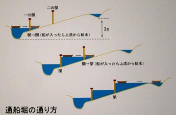 閘門式運河を示す。 [拡大画像: x24661.jpg][拡大画像: x24663.jpg: 通船のしくみ]