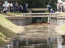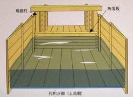 * 次いで、「一の関」にて、長さ2mの角落板と称される板材を一枚ずつ木枠にはめ込みながら、水を堰き止めて