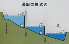 C. 閘門システムと舟の通り方が図解されている。原理的にはパナマ運河と同じである。