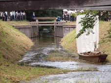 いくという作業が行われた。そして、閘室が水で満たされると舟は閘室内を行き来して通行の様子が再現された。