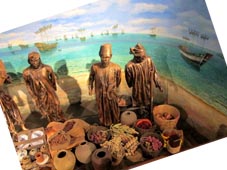 さまざまな交易品が活発に取り引されたが、その情景をジオラマ風に展示する。背景画にはマラッカ沖に数多くの貿易船が