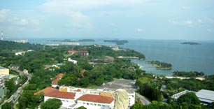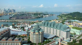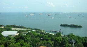 シンガポールのセントーサ島 (全島が複合型巨大リゾートパーク) からシンガポール海峡を俯瞰する。右上方に大型貨物船が左方向