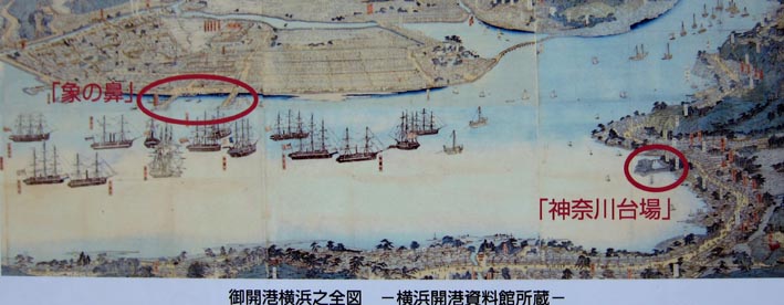 とした使節団が西洋諸国に向けて「象の鼻 Zou-no-Hana (Elephant's Trunk)」(波止場) から出発した。その際にも「神奈川台場」
