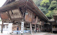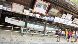奉納された新旧数多くの船絵馬が飾られている、本殿の脇の奉納殿。 [拡大画像: x25165.jpg]