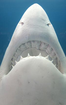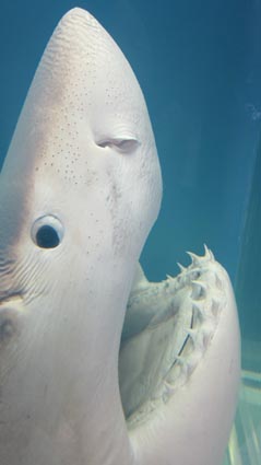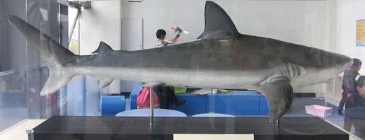 展示された (画像5のメインホール右端に展示) ホホジロザメ (great white shark) の実物の液浸 (えきしん) 標本である。