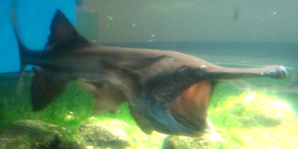 3. 大きな口を開けて開けてプランクトンなどを飲み込み、鰓で濾して食するヘラチョウザメ (生体)。