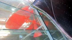 4. 喫水線の水平面に張られたガラス越しに、水のないドライ・ドック下にある6枚角型翼スクリュー・プロペラとラダーを見下ろす。