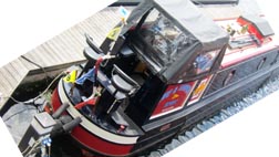 最後尾の操船デッキには、舵板 (ラダー) を左右に動かす舵棒 (ティラー) とスロットル (アクセルレバー) が備わる。ボートの速度は