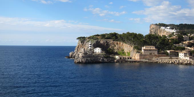 画像2の灯台は、湾口東側の岬 (Punta de sa Creu) に立つ。灯台のすぐ右上の森林の中に
