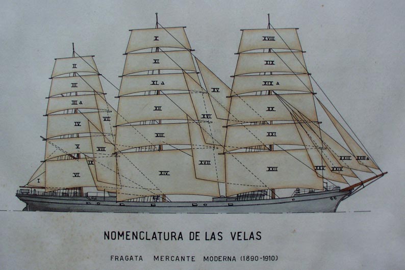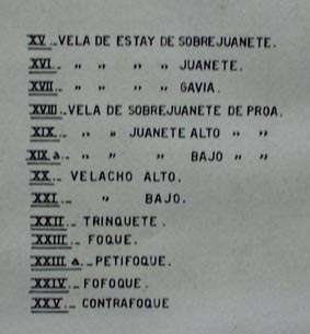 XVI: vela de estay de juanete XVII: vela de estay de gavia XVIII: vela de sobrejuanete de proa XIX: vela de juanete alto de proa XIX.a: vela de juanete bajo de proa XX: velacho alto XXI: velacho bajo XXII: trinquete XXIII: foque XXIII.a: petifoque XXIV: fofoque XXV: contrafoque