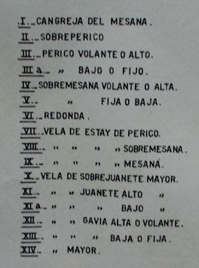 II: sobreperico III: perico volante o alto III.a: perico bajo o fijo IV: sobremesana volante o alta V: sobremesana fija o baja VI: redonda VII: vela de estay de perico VIII: vela de estay de sobremesana IX: vela de estay de mesana X: vela de sobrejuanete major XI: vela de juanete alto major XI.a: vela de juanete bajo major XII: vela de gavia alta o volante XIII: vela de gavia o fija XIV: vela mayor