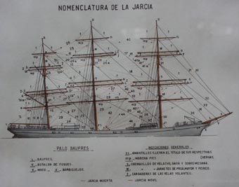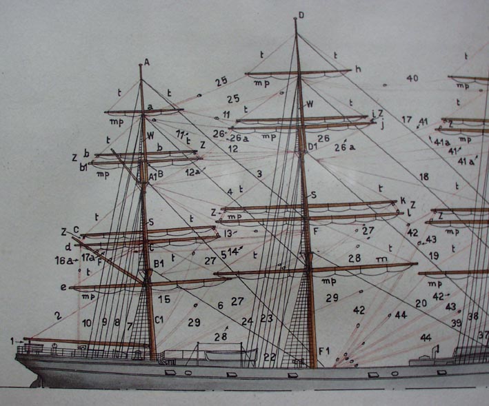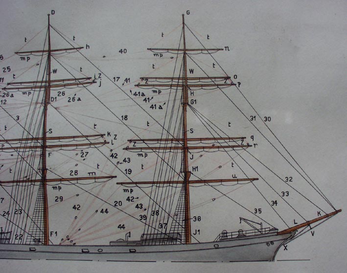 19: estay de gavia 20: estay mayor 21: obenques del mayor 22: burda de gavia mayor 23: burdas de juanete mayor 24: burdas de sobre mayor 25: brazas de sobre mayor 26: brazas de juanete alto 26.a: brazas de juanete bajo 27: brazas de gavia alta 28: brazas de gavia baja 29: brazas de verga mayor