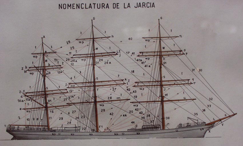 mp: marcha pies s: obenquillos de velacho, gavia y sobremesana w: obenquillos de juanetes de proa, mayor y perico z: cargaderas de las velas volantes