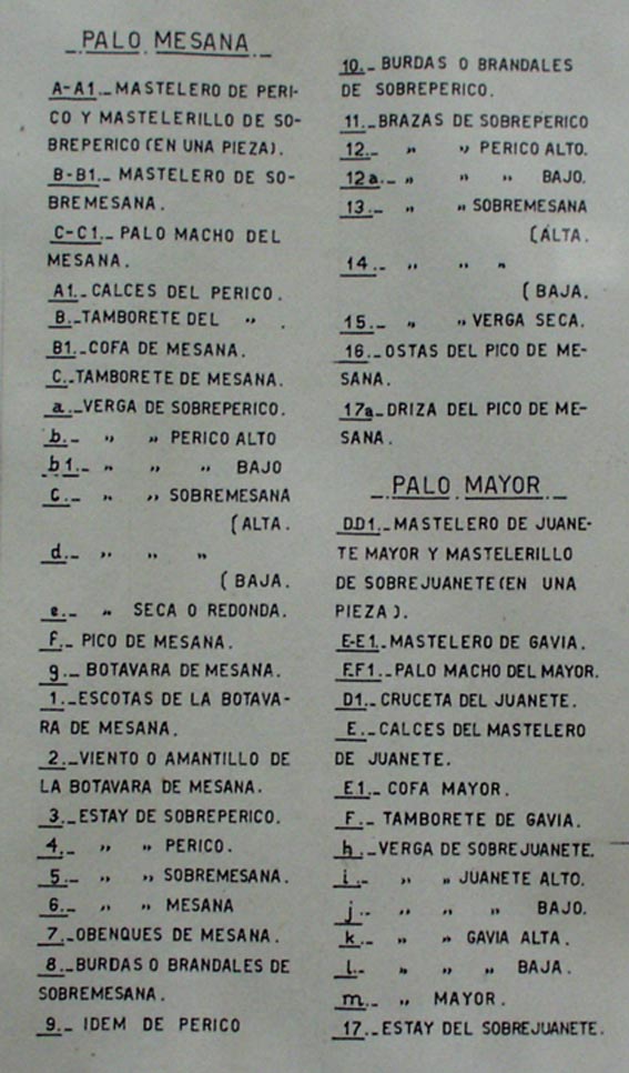 B-B1: mastelero sobremesana C-C1: pala macho del mesana A1: calces del perico B: tamborete del perico B1: cofa de mesana C: tamborete de mesana a: verga de sobreperico b: verga de perico alto b1: verga de perico bajo c: verga de sobremesana alta d: verga de sobremesana baja e: verga seca o redonda f: pico de mesana g: botavara de mesana 1: escotas de la botavara de mesana 2: viento o amantillo de la botavara de mesana 3: estay de sobreperico 4: estay de perico 5: estay de sobremesana 6: estay de mesana 7: obenques de mesana 8: burdas o brandales de sobremesana 9: idem de perico 10: burdas o brandales 11: brazas de sobreperico 12: brazas de perico alto 12.a: brazas de perico bajo 13: brazas de sobremesana alta 14: brazas de sobremesana baja 15: brazas de verga seca 16: ostas del pico de mesana 17.a: driza del pico de mesana