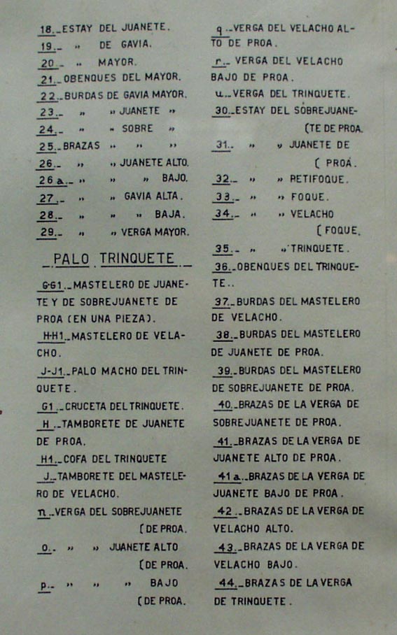 H-H1: mastelero de velacho J-J1: palo macho del trinquete G1: cruceta del trinqute H: tamborete de juanete de proa H1: cofa del trinquete J: tamborete del mastelero de velacho n: verga del sobrejuanete de proa o: verga del juanete alto de proa p: verga de; juanete bajo de proa q: verga del velacho alto de proa r: verga del velacho bajo de proa u: verga del trinquete 30: estay del sobrejuanete de proa 31: estay del juanete de proa 32: estay del petifoque 33: estay del foque 34: estay del velacho foque 35: estay del trinqute 36: obenques del trinquete 37: burdas del mastelero de velacho 38: burdas del mastelero de juanete de proa 39: burdas del mastelero de sobrejuanete de proa 40: brazas de la verga de sobrejuanete de proa 41: brazas de la verga de juanete alto de proa 41.a: brazas de la verga de juanete bajo de proa 42: brazas de la verga de velacho alto 43: brazas de la verga de velacho bajo 44: brazas de la verga de trinquete
