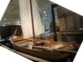 画像1は「栄える利根川水運・商業・そして人」と題する展示コーナーの全景写真である。縮尺1/5の利根川高瀬舟を中心に、その舵、帆、滑車、錨などの舟装備、