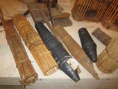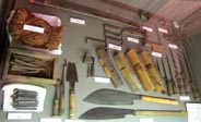 いろいろな船釘、きりん、墨壺(すみつぼ)、つばのみ、カンナ、のこぎり(擦り合わせ)、かすがい、測り用板(はかり