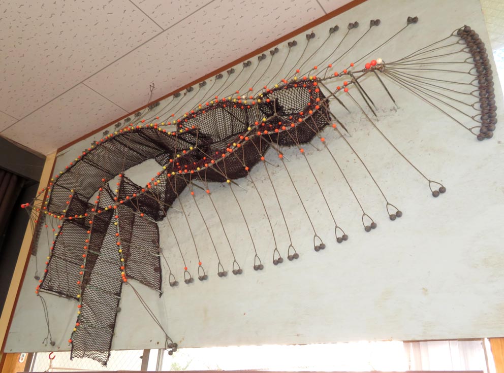 画像1・2は館内に展示される大型定置網の模型である。画像左側にある大型チャンバーの2つの開口部から潮が流れ込むと、