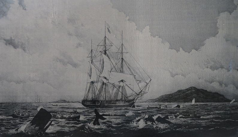 鯨捕りでは小型捕鯨船を繰り出し鯨を投げ銛で仕留めようとする場面を描いている。