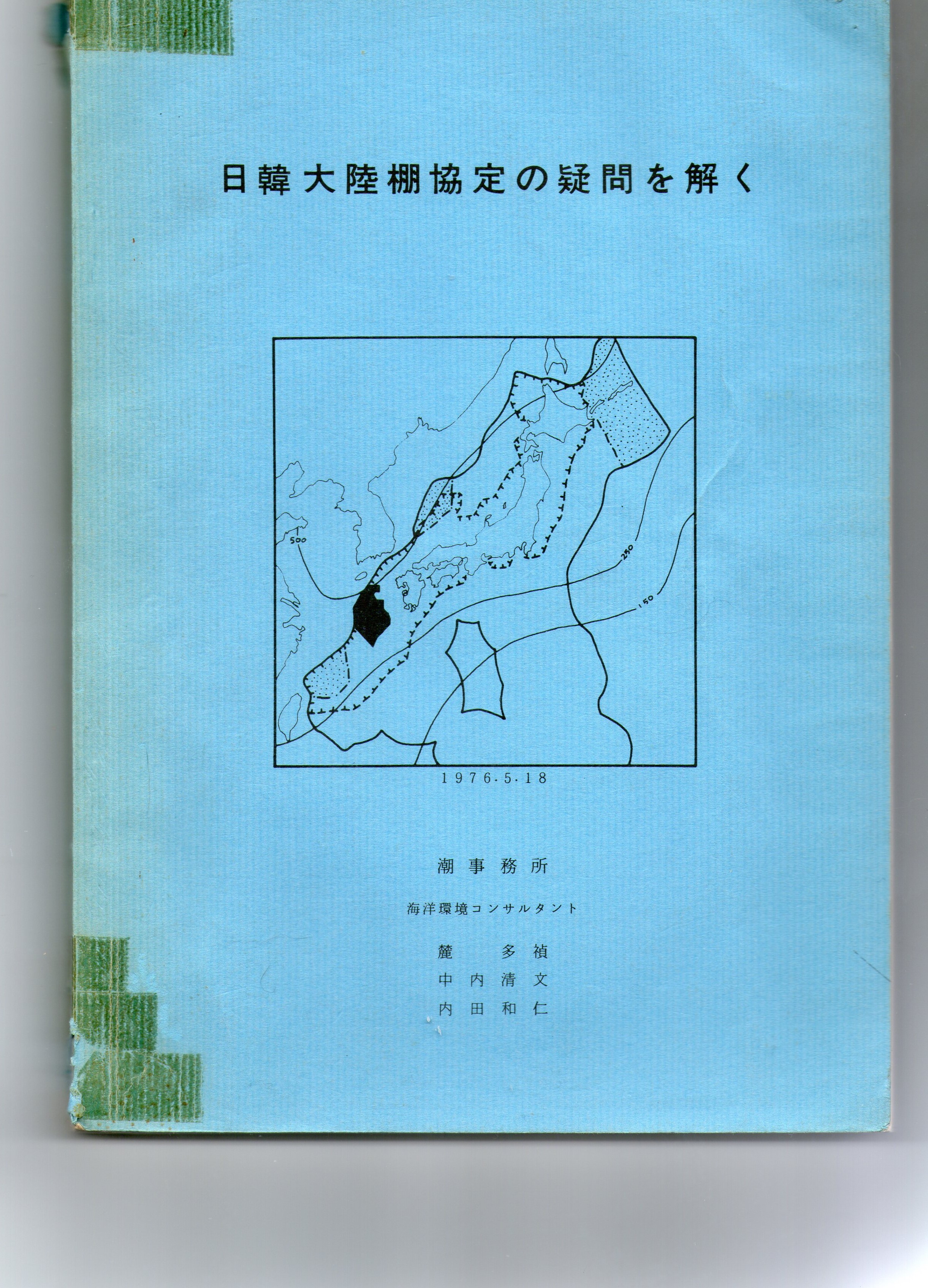 「潮事務所」編纂・発行の海洋調査研究報告書「日韓大陸棚協定の疑問を解く」。1974年。麓多禎・中内清文・内田和仁編集。