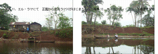 ![]() 写真11. エル・ラマにて 正面から支流ラマ川がはじまる 写真12. エスコンディード川 下流側を望む ![]() 写真13.エスコンディード川沿いの家屋 写真14.エスコンディード川 住民がカヌーで移動