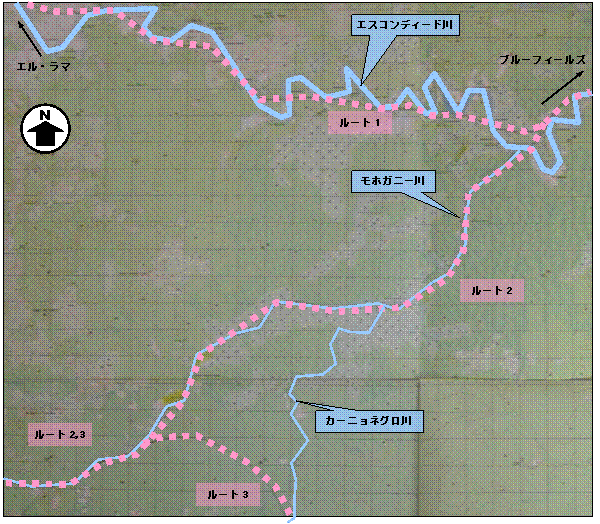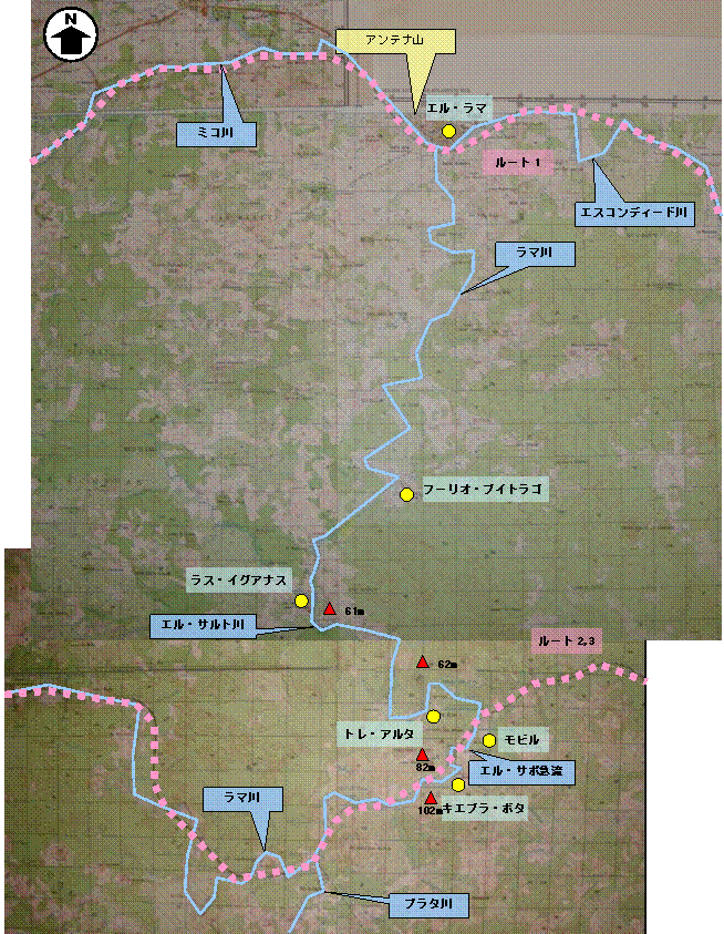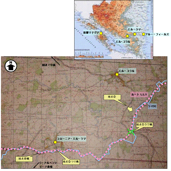 ・ 1日目は、ルート1、2、3の合流地点に近い位置にあるエル・コラル(El Coral)村周辺を視察し、周辺地形とラマ川(Río Rama)