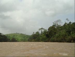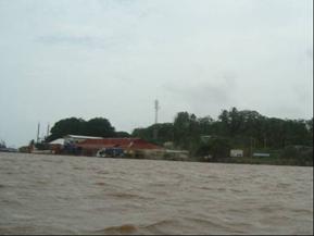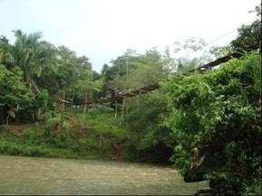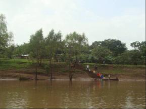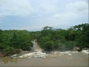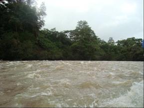 6.1 ラマ川の遡上 エル・ラマからラマ川を遡上した。フーリオ・ブイトラゴ(Julio Buitrago)村やラス・イグアナス(Las Iguanas)村など、 川沿いにいくつかの集落があった。定期船もあり、集落の人々はこれを利用しエル・ラマへ出かけているようだ。 ラス・イグアナス村に上陸し村を見学した。コンクリート製歩道が敷かれていたが、歩道がないところは泥土であった。 村の人の話では、乾季でもラマ川の水面は1m下がる程だとのことだった。年間通じて川水は保たれているようだった。 しかし、視察時の一週間前に大降雨があり、その際は川の水量が急増水し、水面が4-5m上昇したそうである。 そのため川辺の民家は床上浸水したそうだ。水量は極端に減ることはないが、急増することはあるようだ。 さらに進むとトーレ・アルタ(Torre Alta)という地点がある。川岸は岩でごつごつしており大きな淵となっていて、 水深は80m以上とのことだった。 モビル村(Mobile)の辺りから急流域にさしかかる。エル・サポ急流(Rípido El Sapo)では波しぶきが 激しく立っていた。運河ルート3がこのモビル村あたりでラマ川に取りつくことになるであろう。