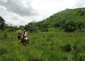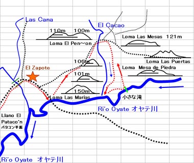 09:00 アコヤパ-サンカルロス間を結ぶ国道とオヤテ川との交点に架かるオヤテ橋付近のオヤテ川視察。 09:40 国道をアコヤパ方面へ数km戻り、エル・サポーテ(El Zapote)に通じる村道に入り、パタコン平原(Llano El Pataco'n)を経て、リオ・デ・アグア川(Río de Agua)に架かる木橋に至る。アグア川視察。 10:00 エル・サポーテ村にてガイド役のカウボーイと合流。ガイドを伴って馬にて最も近傍のオヤテ川岸を目指す。 11:00~14:00 オヤテ川岸からラス・マリアス山(Loma Las Marias)の麓を経て、エル・カカオ川を徒渉し、オヤテ川とエル・ カカオ川との合流点に至る(昼食)。さらに上流にある高みからラス・メサス山、ラス・プエルタス山などを遠望する。 さらに上流を目指してこれらの山々に接近し、オヤテ川にかかる自然の堰(せき)に至る。 18:00 エル・サポーテ村に戻る。 ![]() 4.踏査の目的