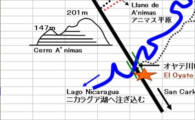 オヤテ川は、北東(右上)から南西(左下)方向へとほぼ破線(緑色)に沿って流れ下り、支流のエル・カカオ川(El Cacao)と合流し、 エル・オヤテ村(El Oyate)を経て、ニカラグア湖(Lago de Nicaragua)へと注ぎ込む。 他方、大西洋(カリブ海)へと流れ下るラマ川(Rama)は図の右上に位置するエル・コラル村(El Coral)の南側(下側)を流れているが、 オヤテ川とラマ川は交わることはない。図の右上をよく見ると、両河川は南北方向に並行してすれ違っているのが分かる。 そのすれ違う辺りがちょうど分水嶺になっていて、ニカラグア運河の有望候補ルートに選定されている「No.1、No.2、No.3」 (注*) のいずれもが共通して通過することになるのが、海抜60-70mの起伏の緩やかなこの分水嶺山系付近である。因みに ニカラグア湖の湖水面は海抜32mほどである。[拡大画像(x23145.jpg)] & Photoshop(x23145.psd)] 注*: ニカラグア政府・大運河検討作業委員会公表(2006年8月)の「ニカラグア両洋間大運河計画書」 Gobierno de Nicaragua, Comisión de Trabajo Gran Canal, "Gran Canal Interoceánico por Nicaragua (GCIN): Perfil del Proyecto", Agosto de 2006.