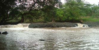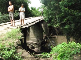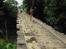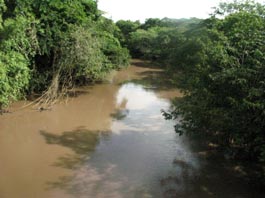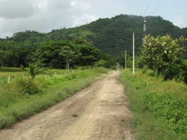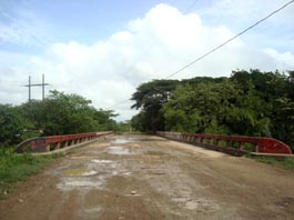 2. 国道から、エル・サポーテ村へ通じる村道に1kmほど入ったところにある平原から見たアニマス山(標高201m)である。 周囲は平らな放牧地ばかりである。ここから2kmほど進むとパタコン平原(Llano Patacón)に至る。 [拡大画像(x23202.jpg)] [参考]スペイン語で高くそびえる山は「montaña」である。山が連なったりすると「montañas」(複数形)、あるいは別の 単語「sierra」(山脈、連山)となる。「cerro」 とは、montañaよりずっと低い山のイメージである。「loma」はまさに丘、丘陵という意味で、「colina」と同義である。 5.3 オヤテ川支流のリオ・デ・アグア川にかかる橋(Puente Río de Agua)付近 1 2