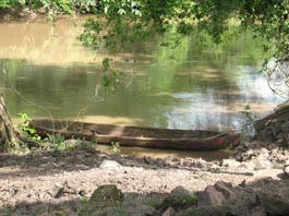 [拡大画像(x23198.jpg)] 5. 橋のすぐ上流川岸に民家がある。最近の集中豪雨時には床下浸水をした。民家の立つ位置からして、現在の 水量よりも少なくとも2m以上水嵩が増加したと推測される。川岸には生活の足として、あるいは緊急豪雨災害などに備えて、くり舟 (丸木舟)が繋がれている。このようなくり舟あるいは平底の川舟風景は地方のいたるところで見かける。 [拡大画像(x23200.jpg)] 5.2 アニマス山(Cerro Ánimas)