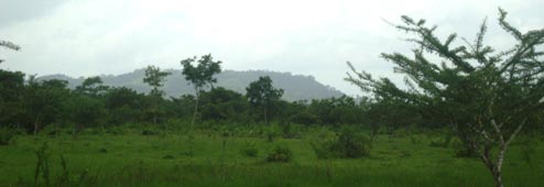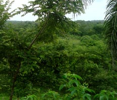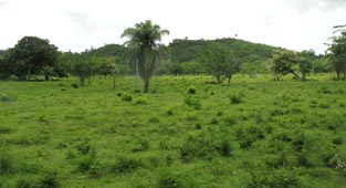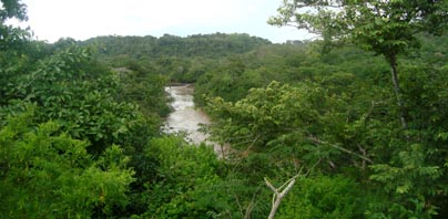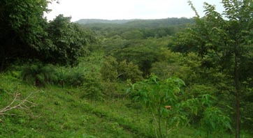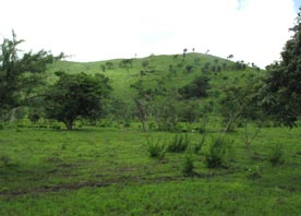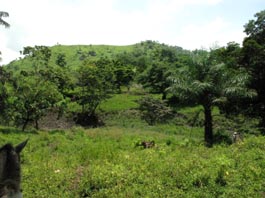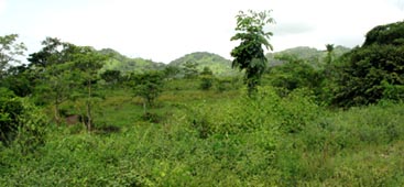 2. 同上。 [拡大画像(x23214.jpg)] 3. 点在する丘の間から垣間見える、目的地のラス・メサス山(Loma Las Mesas)、ラス・プエルタス山(Loma Las Puertas) の山々を遠望する。標高はいずれも120mほどである。今回の踏査の目的は、これらの山頂から、ニカラグア湖とカリブ海 との間にある分水嶺山系の地形などを遠望することである。 [拡大画像(x23215.jpg)] 5.7 エル・カカオ川の渡渉地点 1 2