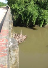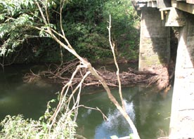 2. 下流側。根こそぎ倒れた巨木が押し流されて来て橋脚に引っ掛かっている。 [拡大画像(x23151.jpg)]