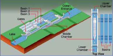 各閘室につき3つの節水槽からなる。