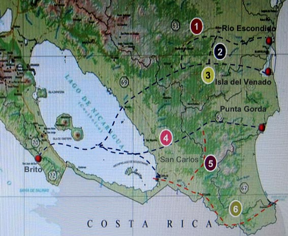 ・ ルート5: プンタ・ゴルダ、サン・ファン川(río San Juan)、サン・カルロス(San Carlos)。